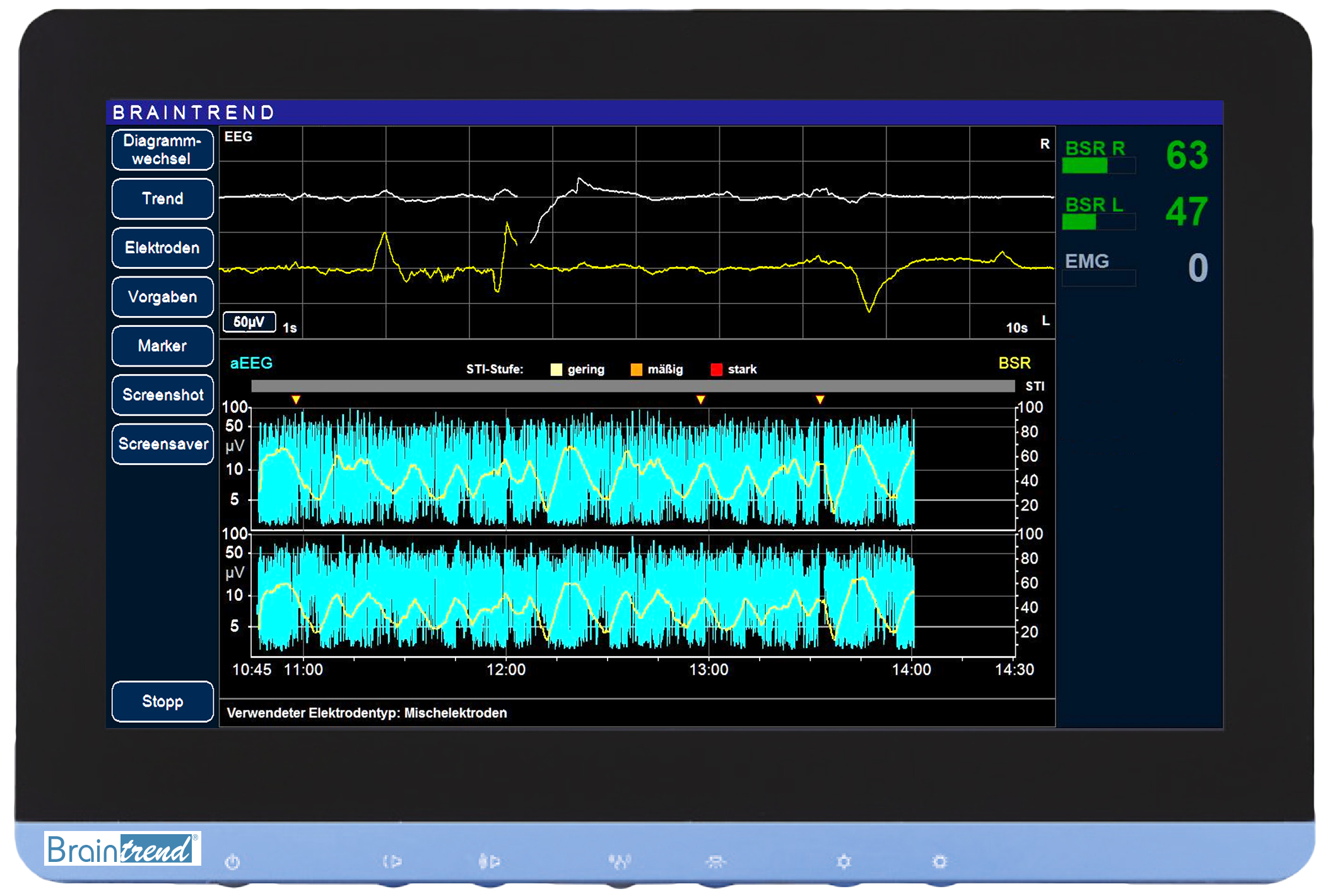 Der Braintrend ist ein flexibel einsetzbarer 2-kanaliger aEEG-Monitor für die Neonatologie und Pädiatrie. Das amplituden-integrierte EEG (aEEG) gibt einen komprimierten Überblick über den Langzeitverlauf des Elektroenzephalogramms.